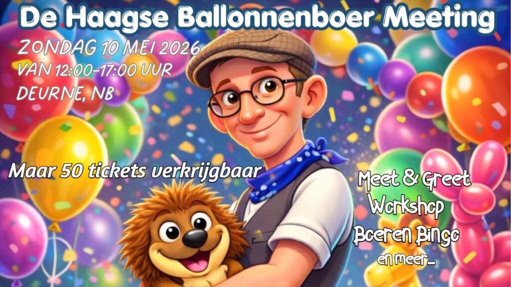 De Haagse Ballonnenboer gaat zijn 1ste MEETING dag organiseren voor zijn fans. Dit gaat plaats vinden in Deurne (Noord Brabant) en is goed bereikbaar met de auto en openbaar vervoer. Vanaf het treinstation is het 6 minuutjes lopen naar de locatie. Dus wil je de Haagse ballonnenboer een keer ontmoeten, kom dan zeker naar zijn MEETING dag.